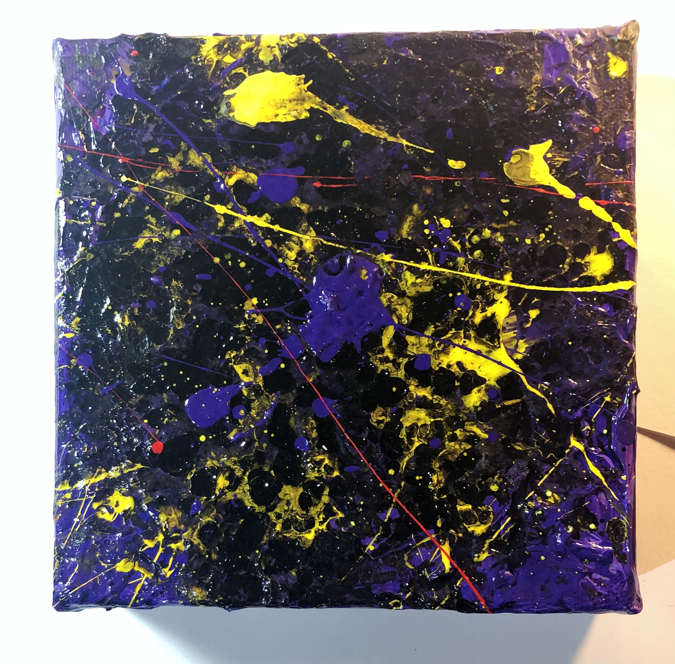 Acrylic, water, and spray fixative on 6″x6″, 1.5″ deep canvas.